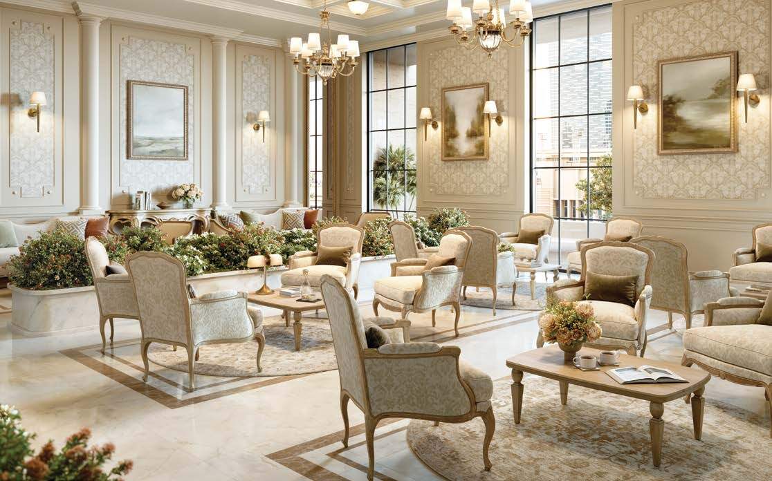 Indoor facilities also include a residents’ lounge with co-working, reading, and social areas, a library, and a children’s creative learning space. In addition, residents can use optional à-la-carte services inspired by Bab Al Qasr Hotel standards, including valet parking, housekeeping and laundry, in-residence dining, childcare services, and transportation arrangements, allowing flexibility between private living and serviced convenience.