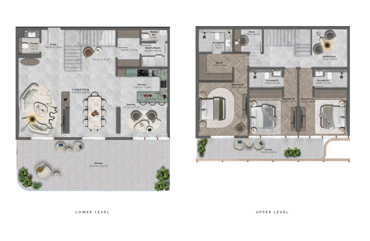 Interiors are characterized by oak finishes, stone elements, refined cabinetry, and minimalist design influences, creating calm and functional living spaces. Loose furniture and decorative items are not included.