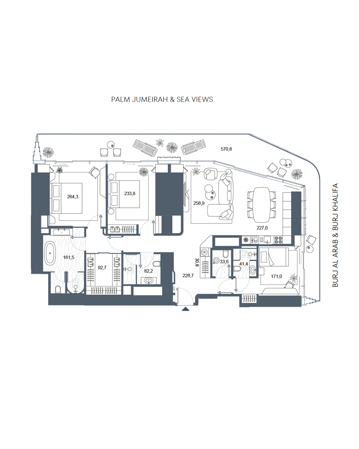 Sky Amenities include an Infinity Pool overlooking the sea, a Lounge Bar, outdoor terraces, and a wellness suite with a Jacuzzi, Sauna, and Steam Baths.