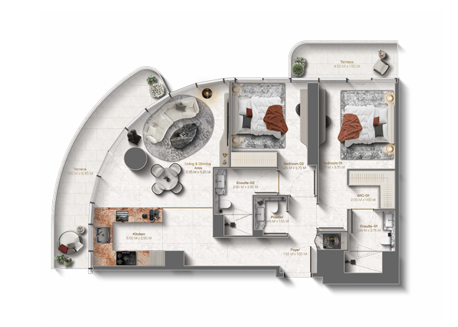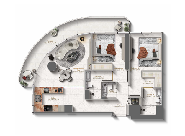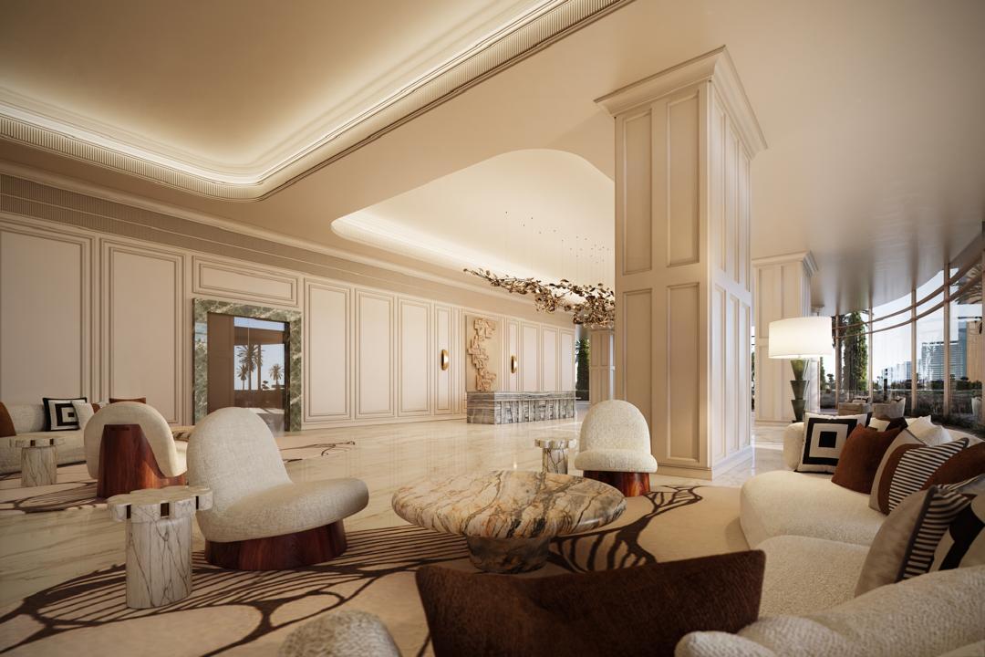 Le Château Residences offer one-, two- and three-bedroom apartments designed with large windows and spacious layouts. Interiors feature floor-to-ceiling glazing and generous balconies that extend living areas outdoors. Kitchens are integrated into open-plan living spaces with neutral materials and functional layouts. Bedrooms are designed to maximize natural light and usable space, while bathrooms include refined finishes and warm neutral tones. Integrated planters and landscaped balconies reinforce the connection between indoor spaces and the surrounding coastal environment.