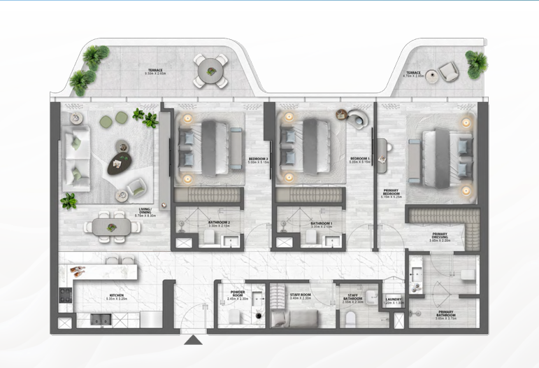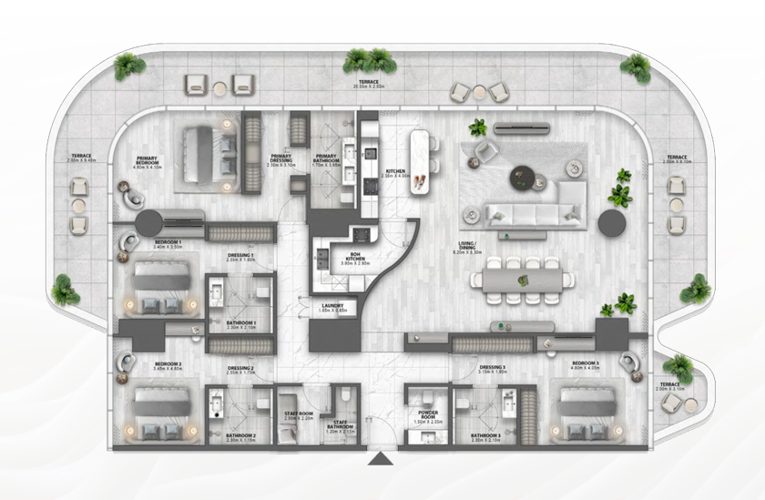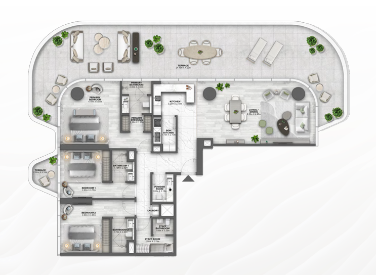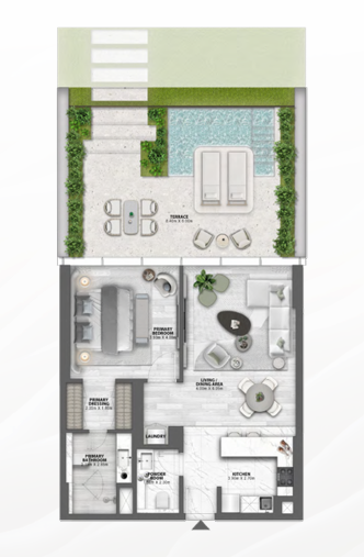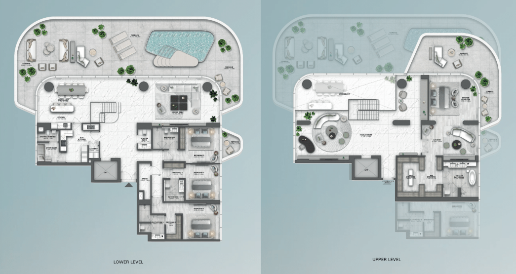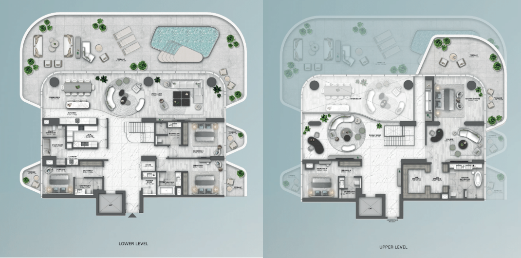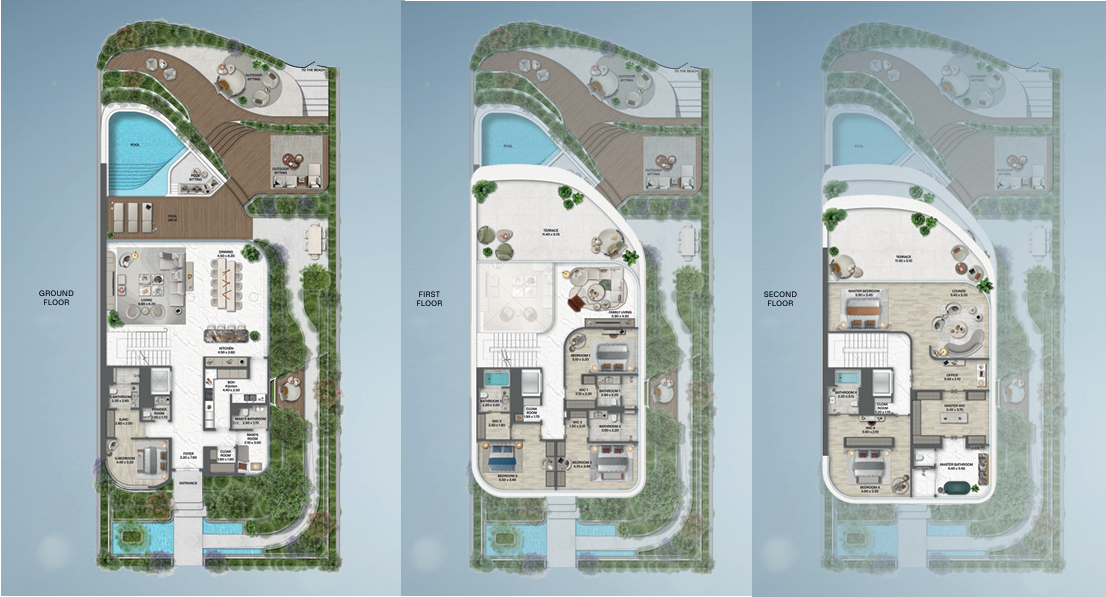 Passo by Beyond offers a mix of residential apartments, penthouses, and standalone beach mansions. Apartments are available in 1-, 2-, 3-, and 4-bedroom layouts. The project also includes a limited number of four- and five-bedroom penthouses and six-bedroom beach mansions with private access and dedicated arrival areas.