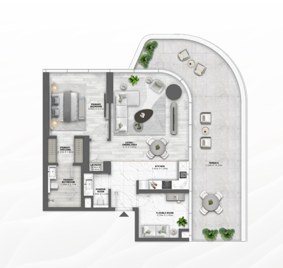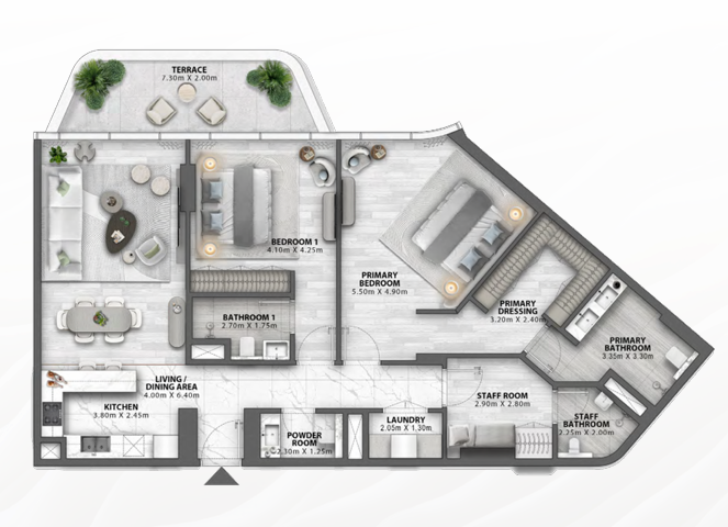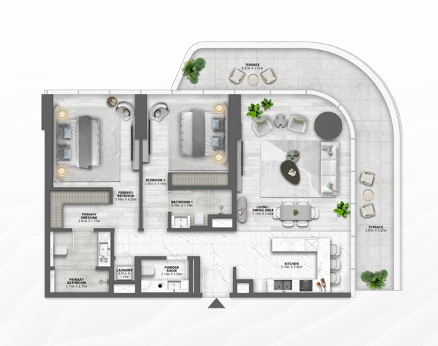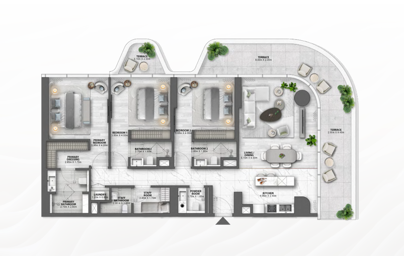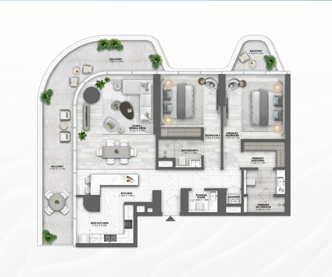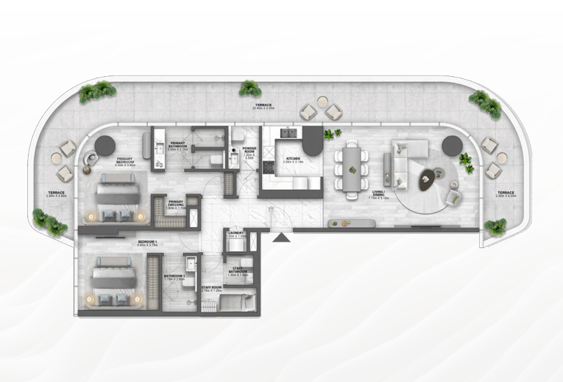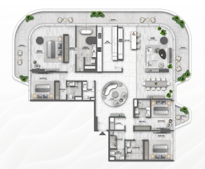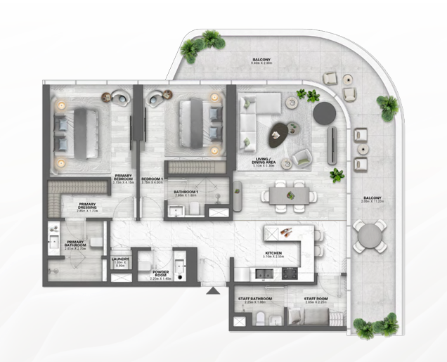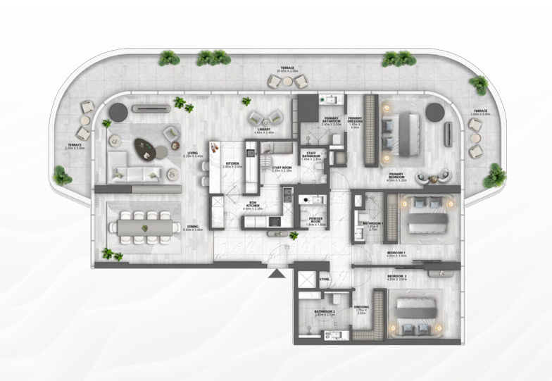 Passo by Beyond offers a mix of residential apartments, penthouses, and standalone beach mansions. Apartments are available in 1-, 2-, 3-, and 4-bedroom layouts. The project also includes a limited number of four- and five-bedroom penthouses and six-bedroom beach mansions with private access and dedicated arrival areas.