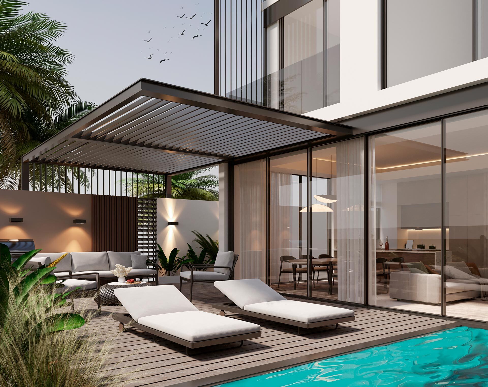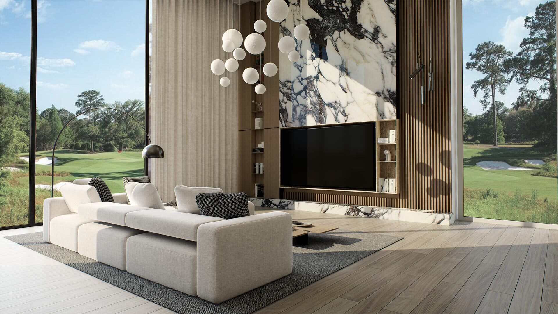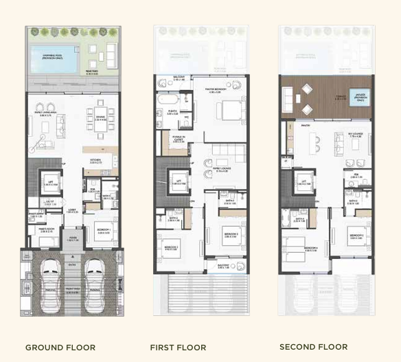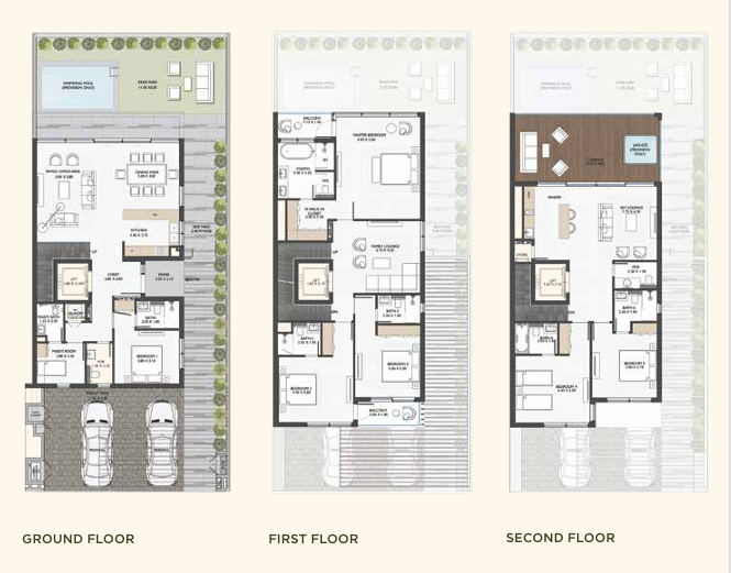 Terra Golf Collection includes six-bedroom villas, twin villas, and townhouses designed with open layouts and large windows overlooking the golf course. Residences range from approximately 4,773 to about 8,700 square feet and include living areas, bedrooms, bathrooms, and outdoor spaces. Villas feature additional spaces such as sky lounges, cinemas, family lounges, terraces, and private gyms. Each residence includes landscaped backyards with direct views of the golf course. Townhouses include sky lounges and family lounges with integrated indoor and outdoor living design.
